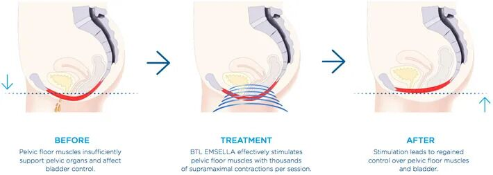 BTL Emsella is a non-invasive procedure that treats urinary incontinence through HIFEM (High-Intensity Focused Electromagnetic Technology) electromagnetic stimulation. Every treatment session gives the pelvic floor muscles ample stimulation through regular contractions.