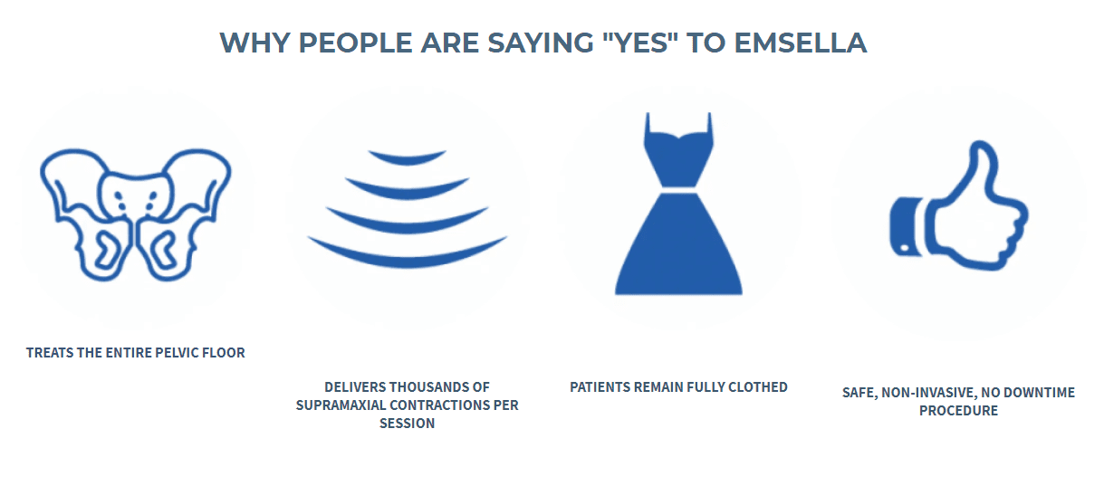Patients of all ages can benefit from Emsella; though urinary incontinence becomes chronic as we get older, it is not uncommon for even young people to suffer from it.