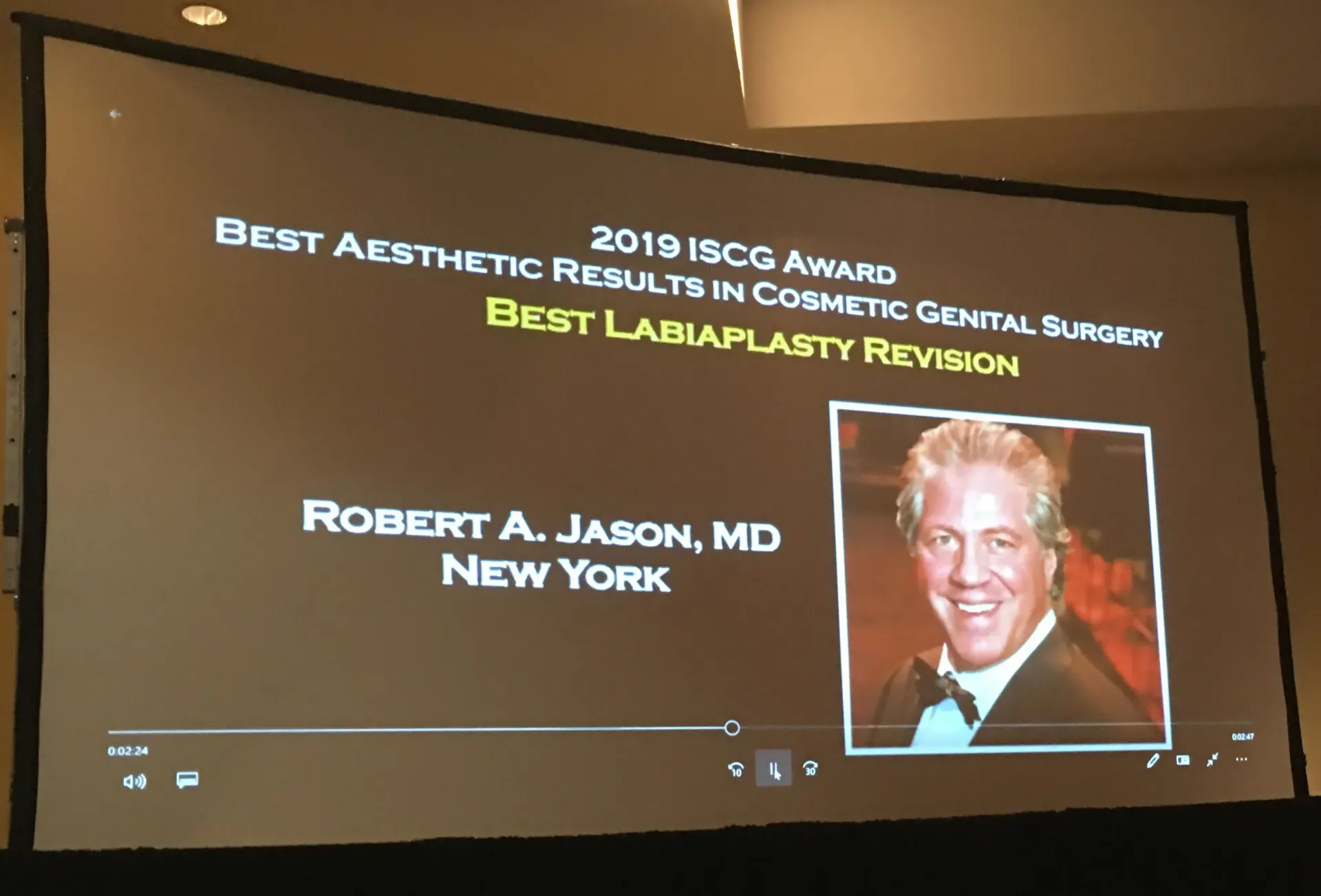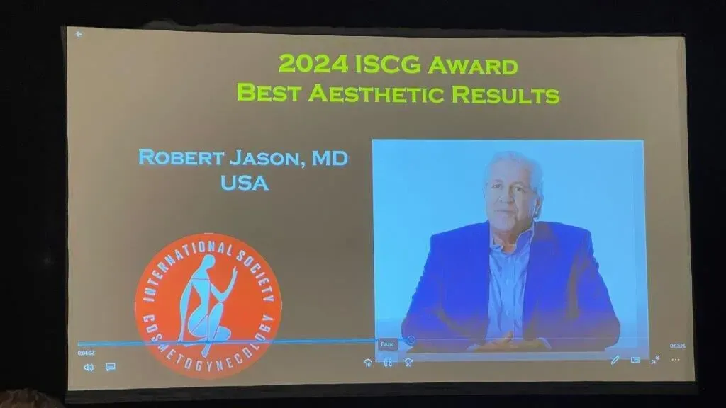 Dr. Jason being announced at the International Society of Cosmetic Gynecology, pre Congress of the American Academy of Cosmetic Surgery where he was the 2019 winner for Best Aesthetic Result for the Category “Best Labiaplasty Revision” at their recent conference in Orlando, Florida.