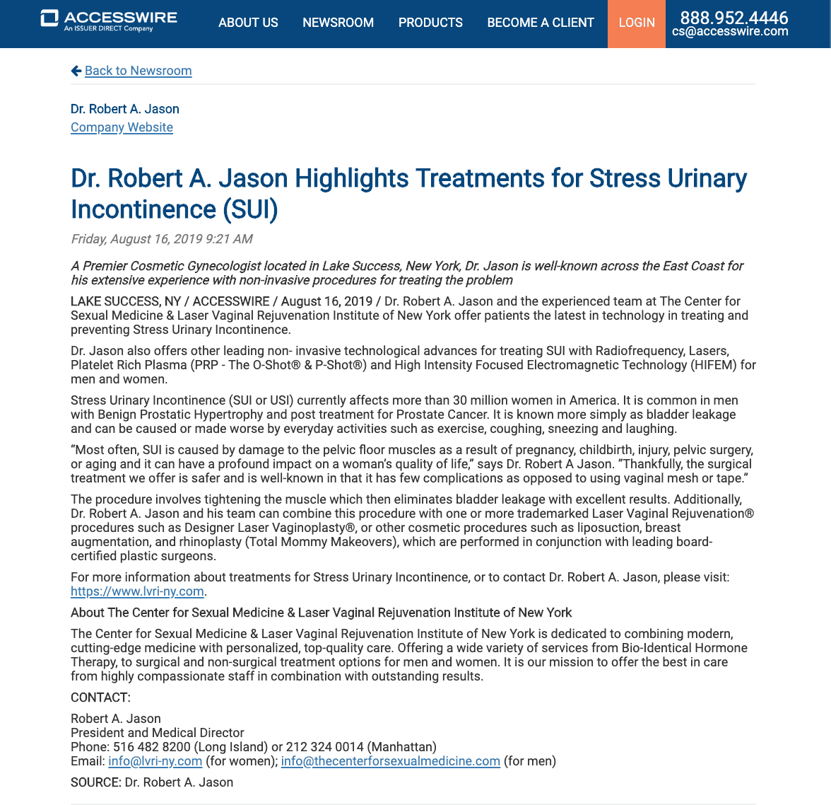 For many women, sex is no longer as enjoyable or comfortable as it once was. As a result, their personal relationship with their partner is adversely affected. These women suffer in silence. Dr. Robert Jason, the founder of the Laser Vaginal Rejuvenation Institute of New York, has made it possible to end their anguish and renew their spirit. These relatively painless and bloodless procedures not only make “sex feel better,” they help the patient feel better about herself.